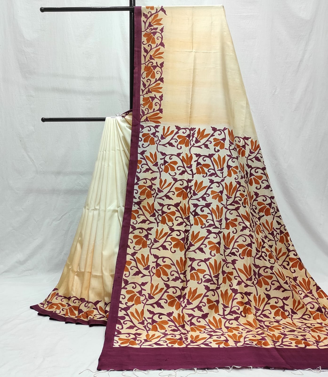 This saree is a breathtaking fusion of hand-painted artistry, this particular piece is inspired by the bengali Alpona art. Our hand-painted sarees are a unique creation, often available in a single piece. In rare instances, we may create a second piece, but each saree will feature a different design combination, making each one truly exclusive.