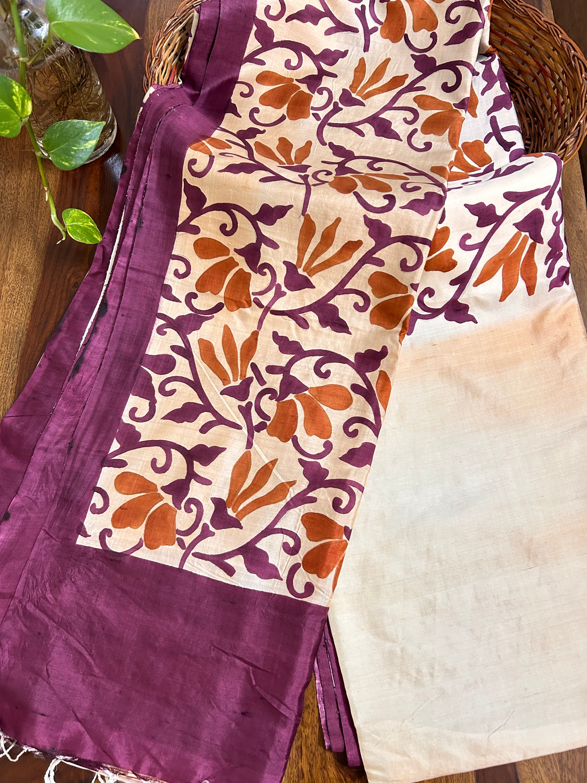 Work: We begin by sketching the motifs on the saree using a pencil. Then, each design is carefully hand-painted, after which the saree is steamed to set the colors. There is a brush stroke shading affect through out the body. We have used sangria tones paired with a golden yellow as the colour palette of this saree.