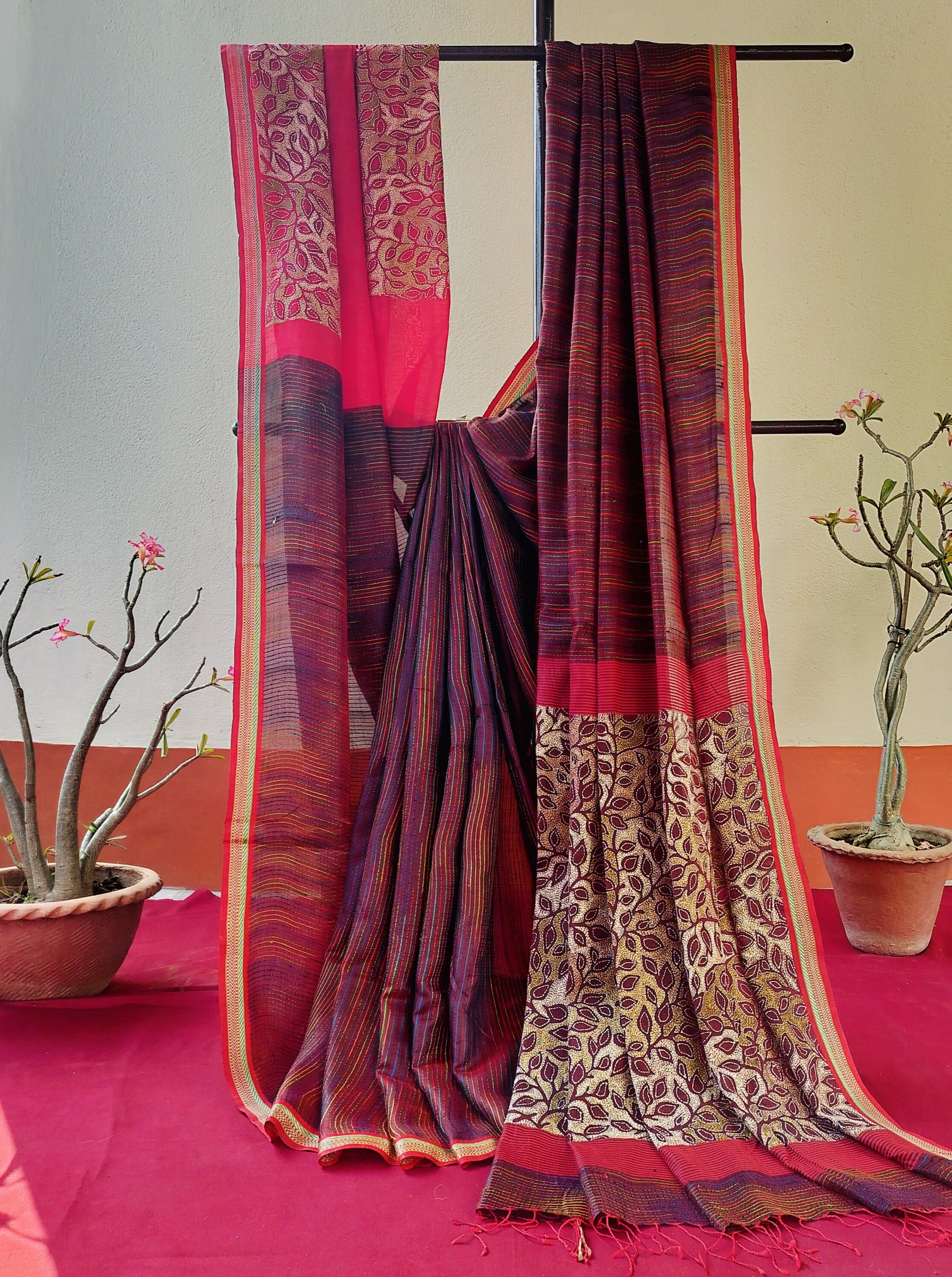 Work: We have been mastering this saree for the last two decades. For the warp and weft, we have used Bangalore silk and Resham silk, and the vertical woven stripes in the body are done using Matka silk. It has a sleek Jacquard border. And the pallu and blouse piece is adorned with our signature reverse Kantha embroidery.