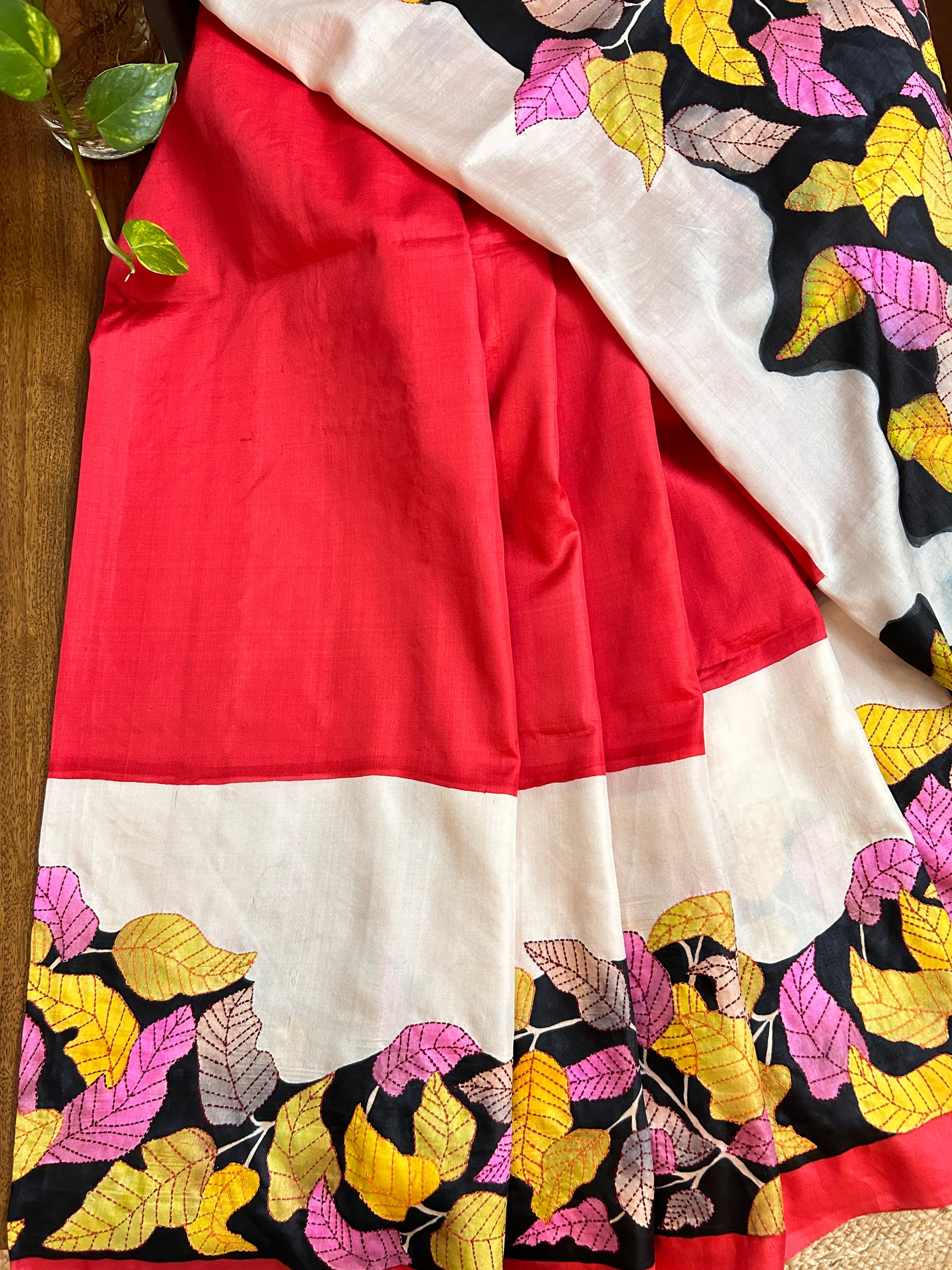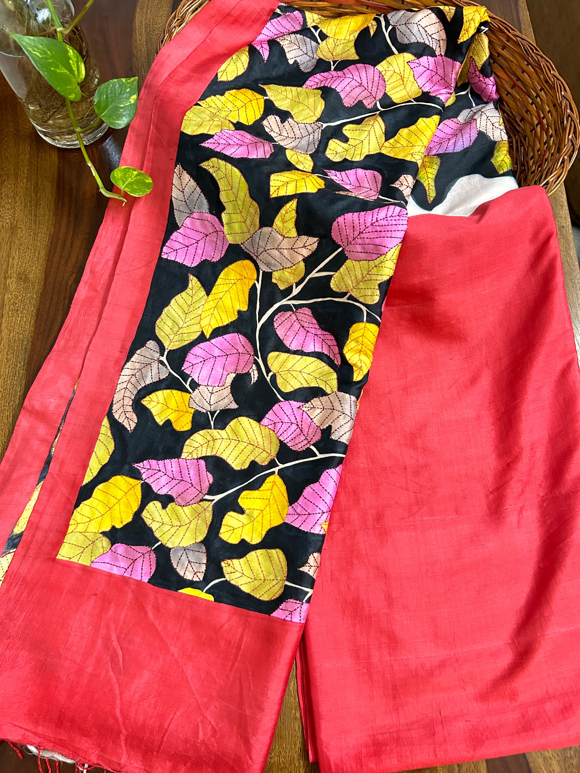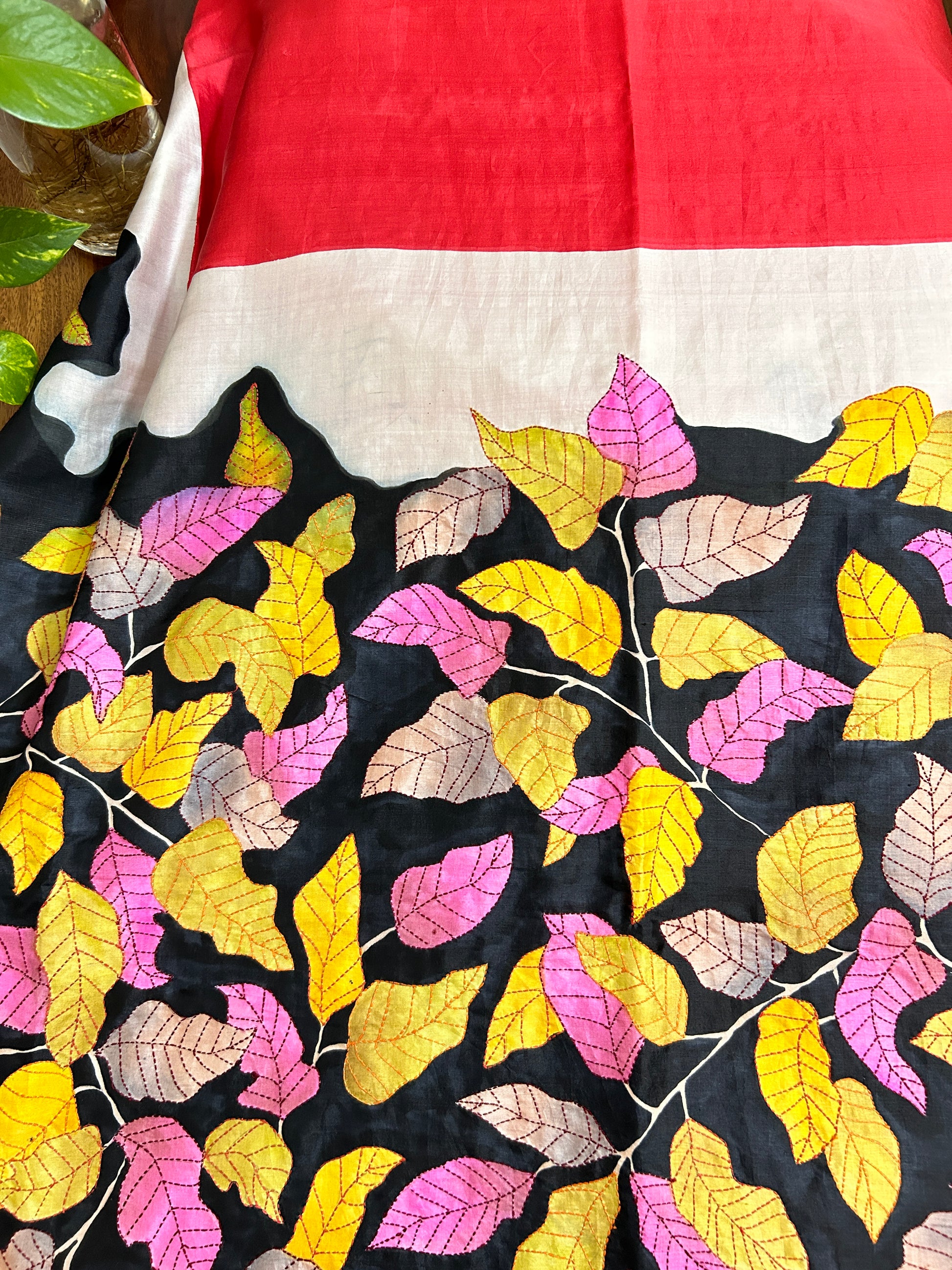 Work: We begin by sketching the motifs on the saree using a pencil. Then, each design is carefully hand-painted, after which the saree is steamed to set the colors. Finally, the intricate Kantha embroidery adds depth and texture to bring the design to life. The design will fall all over the palla and continue on both the borders.