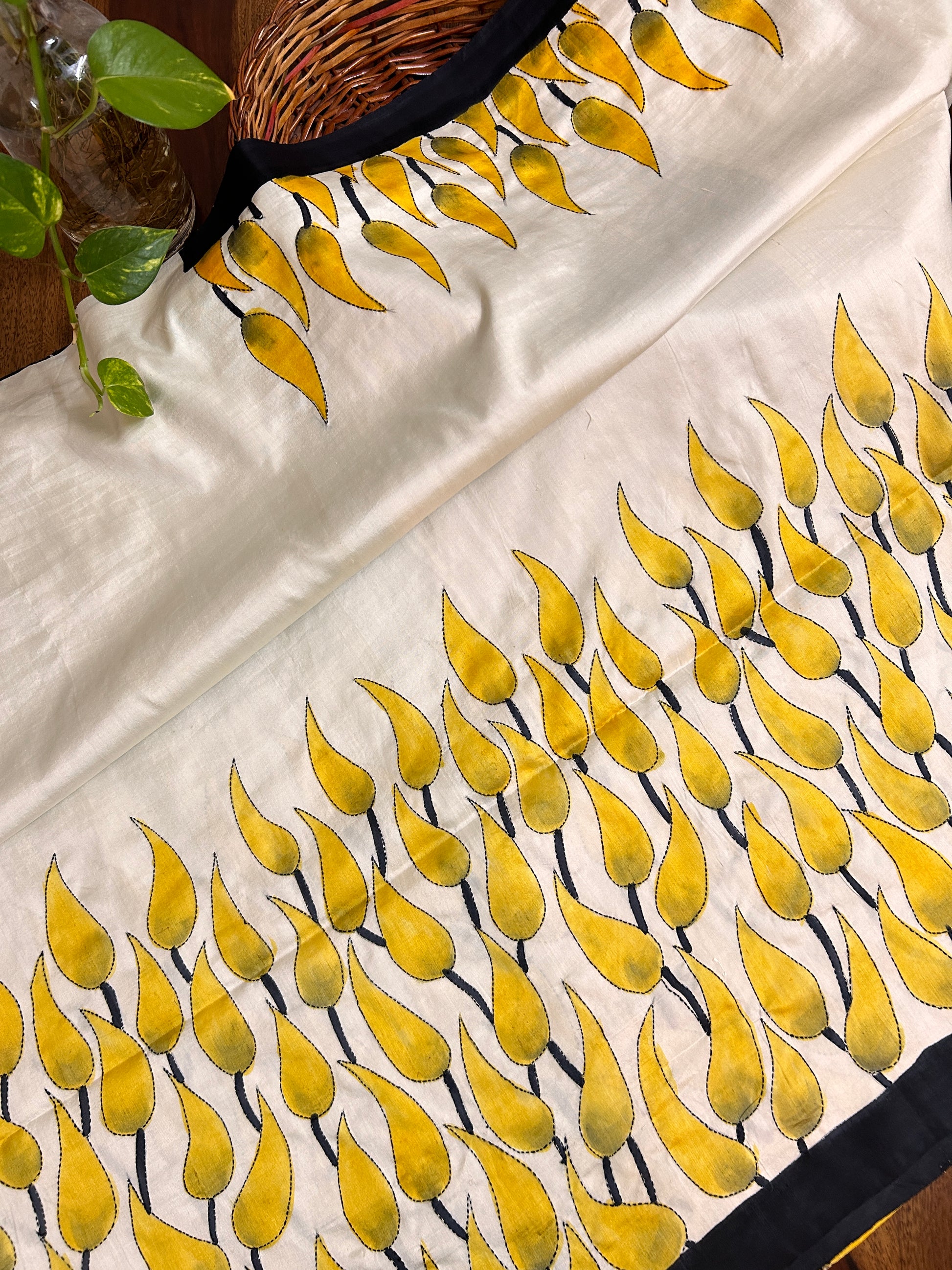 Work: We begin by sketching the motifs on the saree using a pencil. Then, each design is carefully hand-painted, after which the saree is steamed to set the colors. Finally, the intricate Kantha embroidery adds depth and texture to bring the design to life. The design will fall all over the palla and continue on both borders. The bottom border is fuller than the top border.