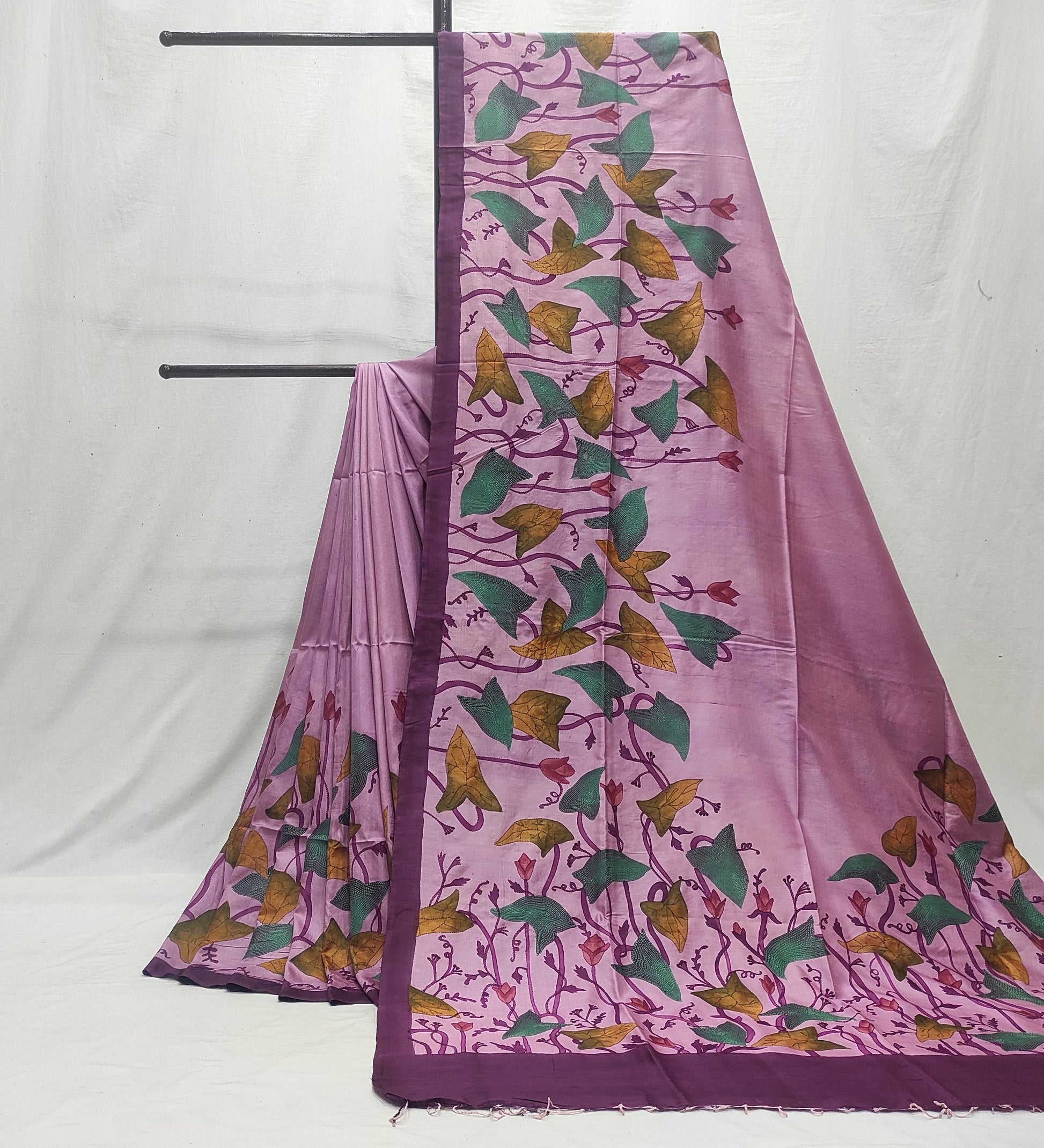 Work: We begin by sketching the motifs on the saree using a pencil. Then, each design is carefully hand-painted, after which the saree is steamed to set the colors. Finally, the intricate Kantha embroidery adds depth and texture to bring the design to life. In this saree, the design falls all over the palla and both the borders. The top border is thinner than the bottom border.