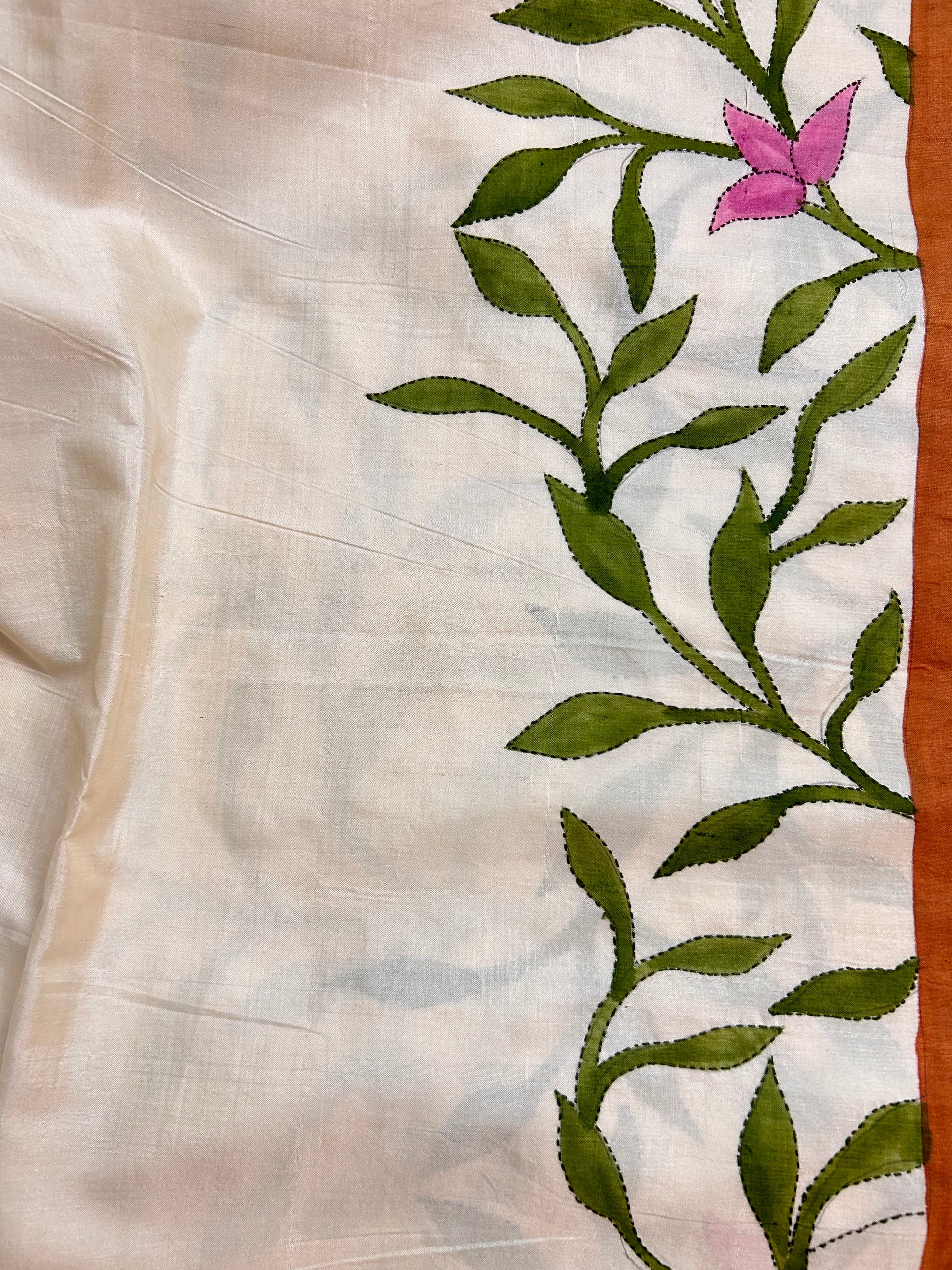 Work: We begin by sketching the motifs on the saree using a pencil. Then, each design is carefully hand-painted, after which the saree is steamed to set the colors. Finally, the intricate Kantha embroidery adds depth and texture to bring the design to life. The design will fall in the pallu and the body, and form the bottom border from pleats onwards till the end.
