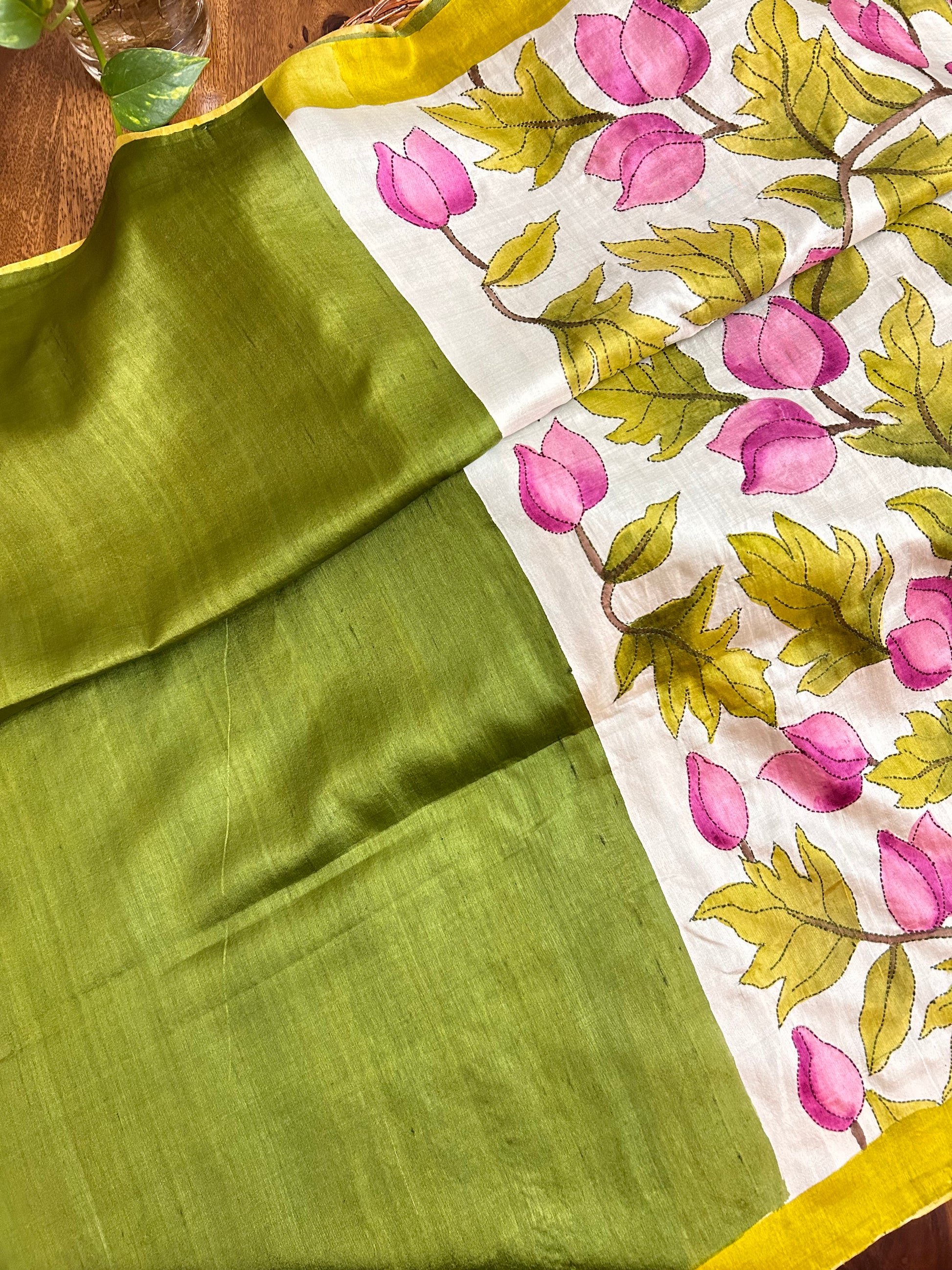 Work: We begin by sketching the motifs on the saree using a pencil. Then, each design is carefully hand-painted, after which the saree is steamed to set the colors. Finally, the intricate Kantha embroidery adds depth and texture to bring the design to life. The design will fall all over the pallu and the body. Pleats onwards this saree is solid green with a pear green border.