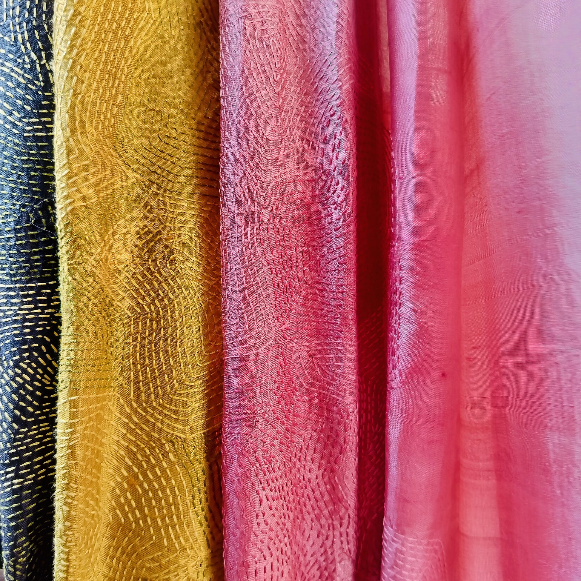Work: This saree showcases a unique abstract motif. We begin by sketching the motifs on the saree using a pencil. Then, each design is carefully hand-painted, after which the saree is steamed to set the colors. Finally, the intricate Kantha embroidery adds depth and texture to bring the design to life.