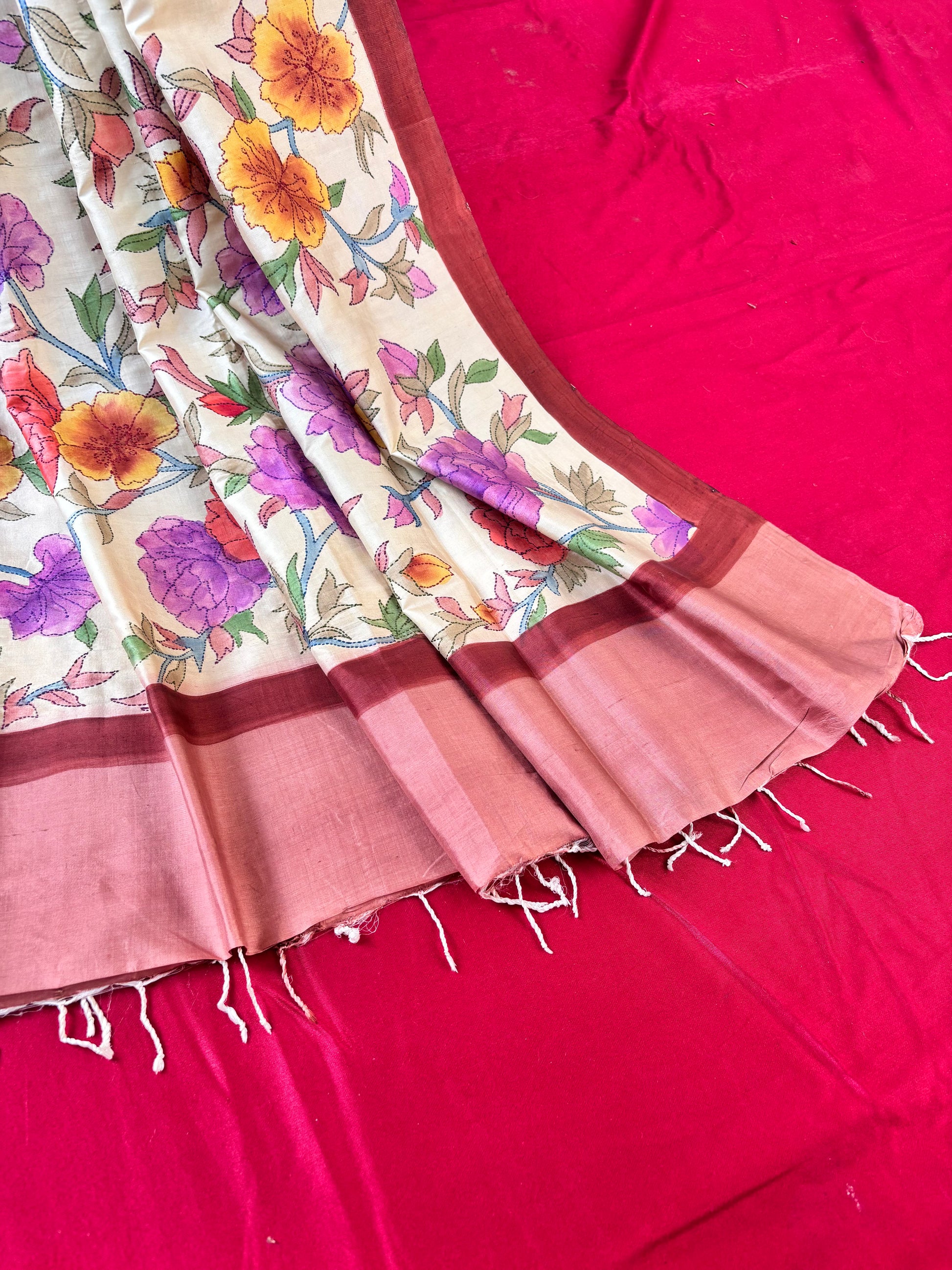 Work: We begin by sketching the motifs on the saree using a pencil. Then, each design is carefully hand-painted, after which the saree is steamed to set the colors. Finally, the intricate Kantha embroidery adds depth and texture to bring the design to life. The design will fall on the palla and the body. From the pleats, the saree has a ombre dye effect.